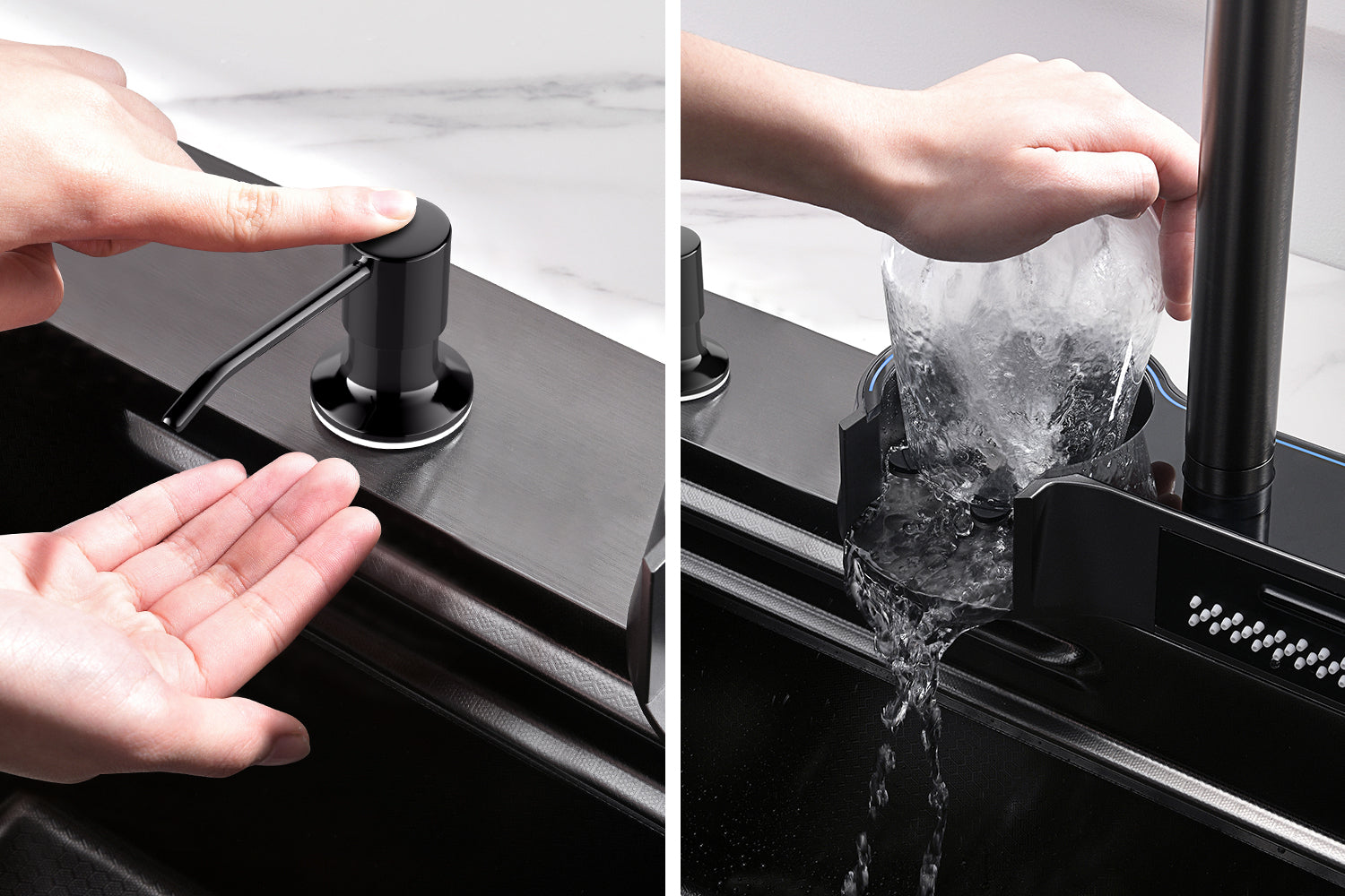 ویژگیهای اضافی که در یک سینک دو منظوره آشپزخانه گنجانده شده است میتواند شامل دستگاههای صابونساز داخلی باشد، در نهایت، هدف یک سینک چند منظوره آسانتر و کارآمدتر کردن کارهای آشپزخانه است و در عین حال باعث صرفهجویی در فضای با ارزش پیشخوان و ذخیرهسازی میشود.